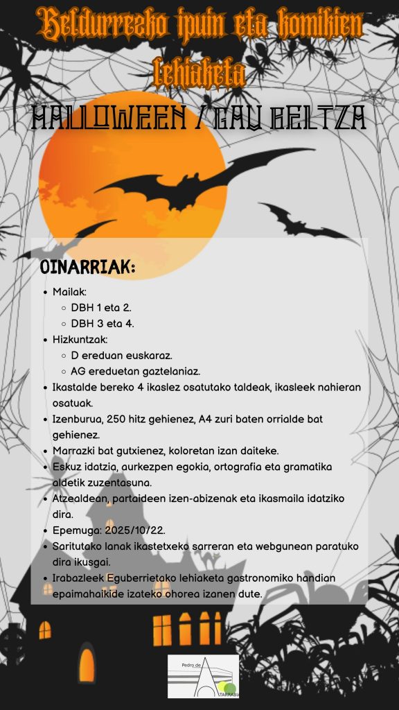 Beste behin ere, Ipuin eta Komikien Lehiaketari esker, Pedro de Atarrabia insititutuko ikasleek haien sormen beldurgarriena abian jarri dute. Lehiaketa honetan, ikasleek, ipuin labur eta komikien bitartez, kontakizun ilunak, izu, misterio eta ikaraz beteak, sortu dizkigute; irudi eta marrazkiak lagun, hotzikara eta itolarria areagotuz.Oroz gain, ikasleoi gure esker ona adierazi eta aitortza egin nahi diegu, urtetik urtera haien lanak irakurriz kikilduago gelditzen baikara. 2025eko Halloween/Gau Beltzan hainbat saritu baditugu, komiki eta ipuin sailetan eta euskara eta gaztelaniazko 1. eta 2. mailak batetik, eta 3. eta 4. mailak bestetik, bereizitako kategoriatan. Hauek dira irabazleak: